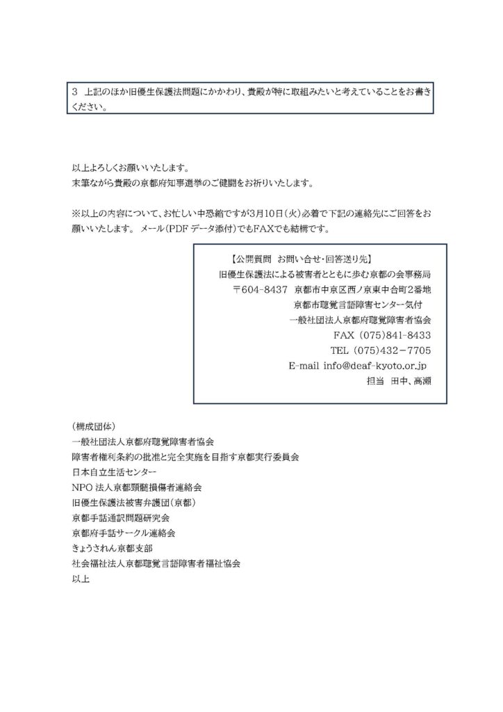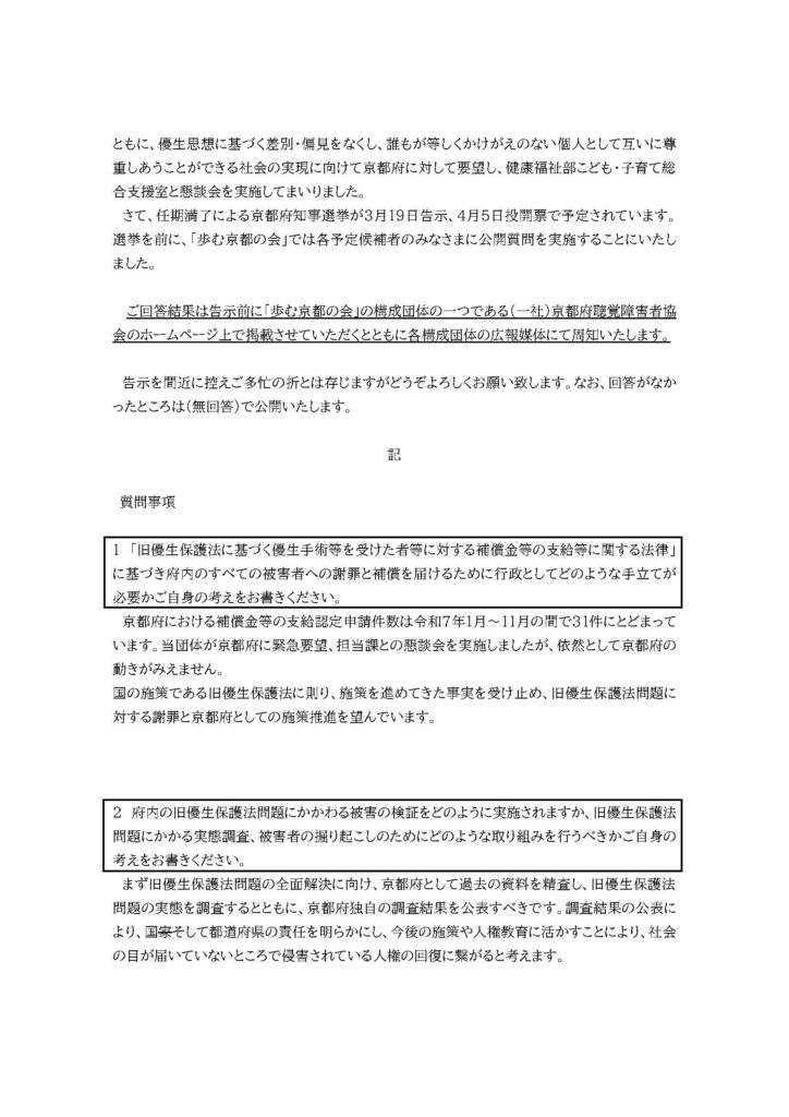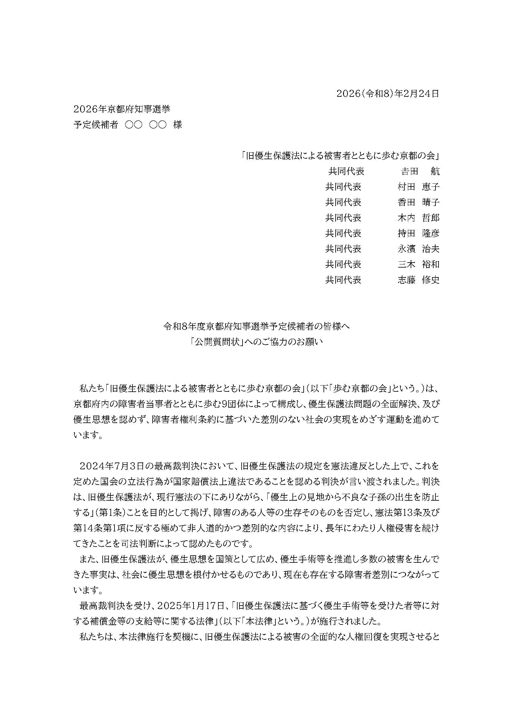 2026(令和8)年4月5日投票予定の京都府知事選挙を前に、「旧優生保護法による被害者とともに歩む京都の会」として、予定候補者に対して、旧優生保護法問題にかかる政策について「公開質問」を実施しました。